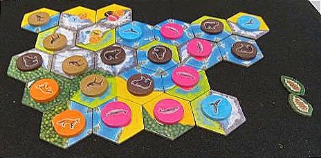 ‘So there I was,’ (as every great battle story begins), with a commanding lead on the plains & forests terrain fronts with a smooth salmon run down the middle. After a break in the action halfway into the game, my turn is up & I find another valuable salmon token to keep my run going. After carefully placing the token on its tile, by some force yet to be understood, the pink salmon became a blue eagle before my eyes.